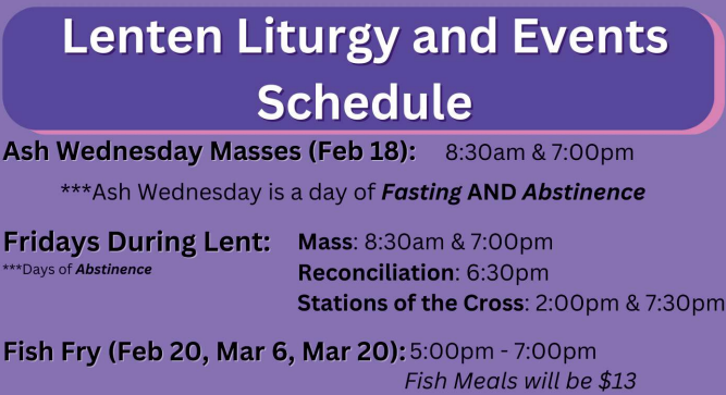 *Correction: Ash Wednesday masses are at 8:30 am, 12pm and 7 pm.